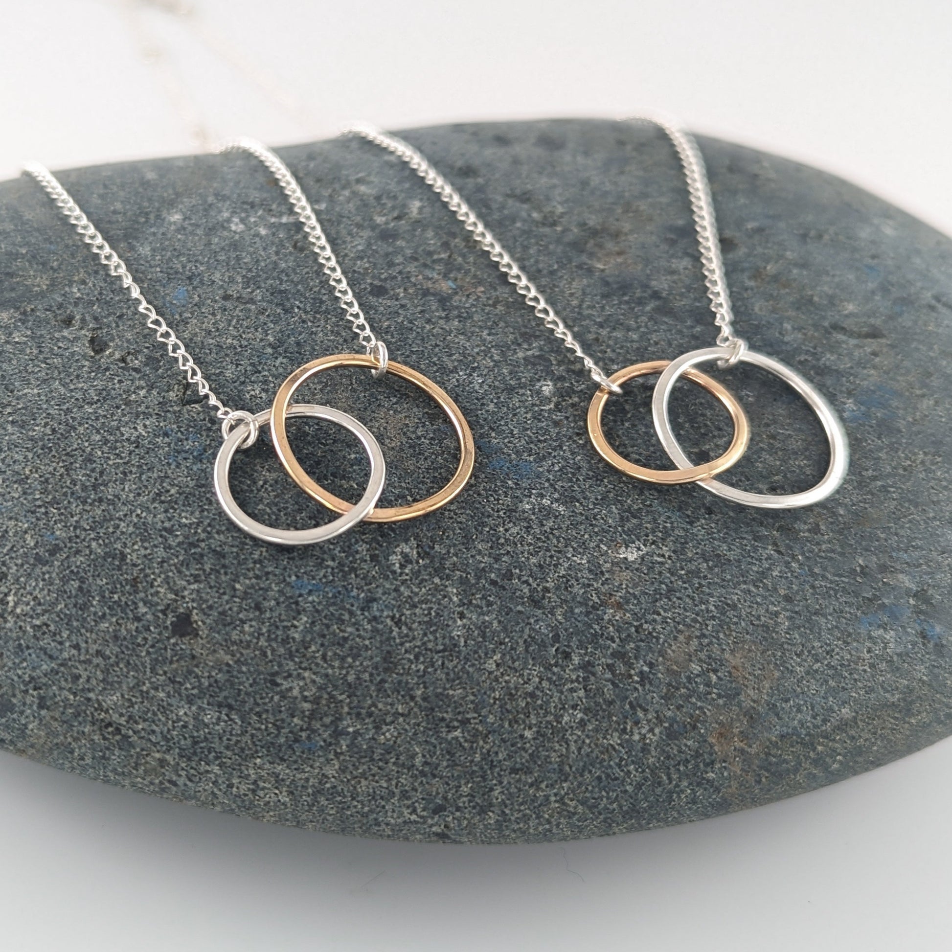 Locked together in endless embrace, our interlocking circles pendant will become one of your favorite ways to elevate any outfit. This delicate and sophisticated pendant is handmade using 16 gauge tarnish-resistant sterling silver and yellow gold fill. With a smooth shiny pairing of both metals, it will complement both your silver and gold jewelry. Choose between a large gold fill and a large silver circle depending on which metal you'd like more prominent.